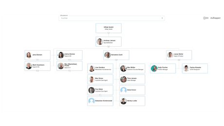 Unser Organigramm ist extrem einfach in der Benutzerführung. So kann jede berechtigte Person mit wenigen Klicks relevante Strukturen einsehen oder auch nach beliebigen Personen aus dem Unternehmen suchen. Das Organigramm klappt sich dann automatisch an der Stelle auf, in der die Person angesiedelt ist.