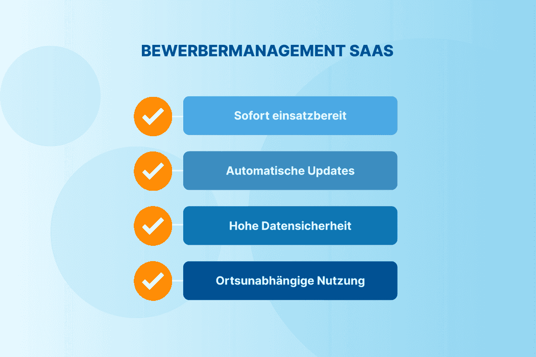 Sofort einsatzbereit: Die Software ist ohne Installationsaufwand nutzbar und kann innerhalb weniger Stunden produktiv eingesetzt werden. Automatische Updates: Neue Funktionen und sicherheitsrelevante Erweiterungen werden zentral eingespielt – ohne Unterbrechungen für Anwender. Hohe Datensicherheit: SaaS-Anbieter investieren stark in Datenschutz, Verschlüsselung und zertifizierte Hosting-Umgebungen. Ortsunabhängige Nutzung: Recruiter und Hiring Manager können jederzeit von Laptop, Tablet oder Smartphone aus auf das System zugreifen. Transparente Kosten: Häufig kommt ein Abomodell statt hoher Einmalkosten zum Einstatz. Unternehmen zahlen nur für die tatsächlich benötigten Funktionen und Benutzer.